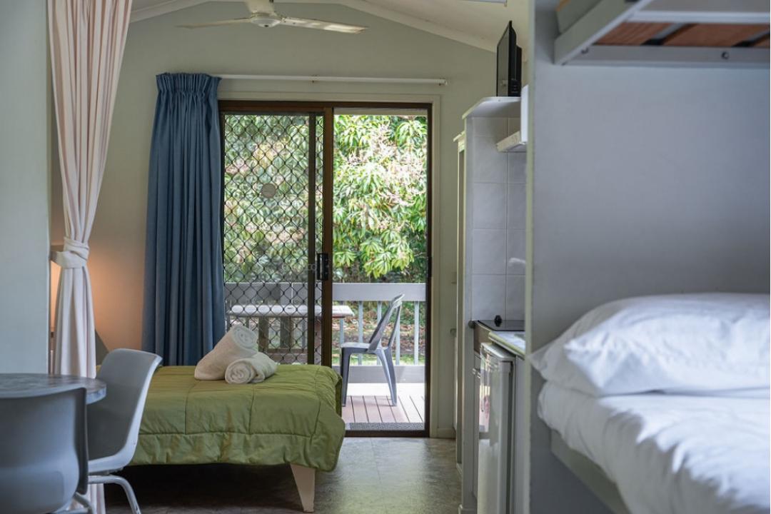 | Open Plan with Double bed, 2 Bunk beds | Patio Table and Chairs | Port-a-cot hire for $20 per stay |