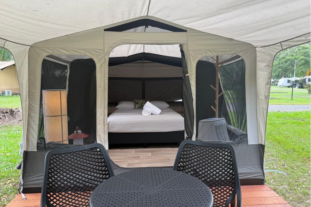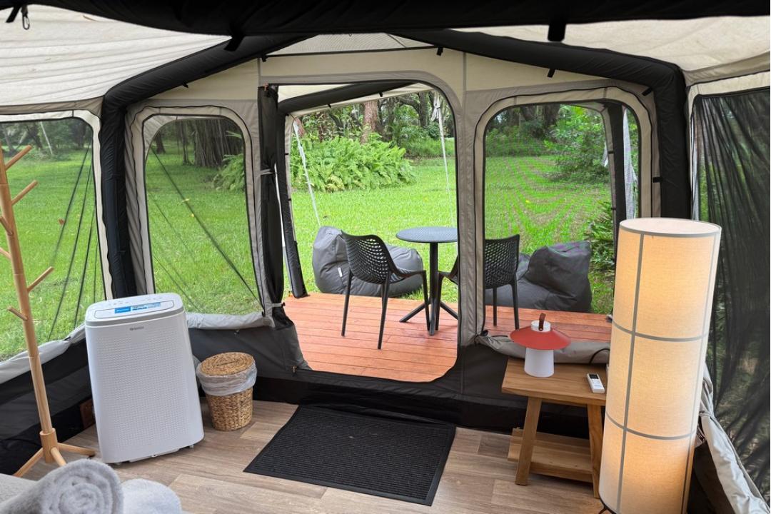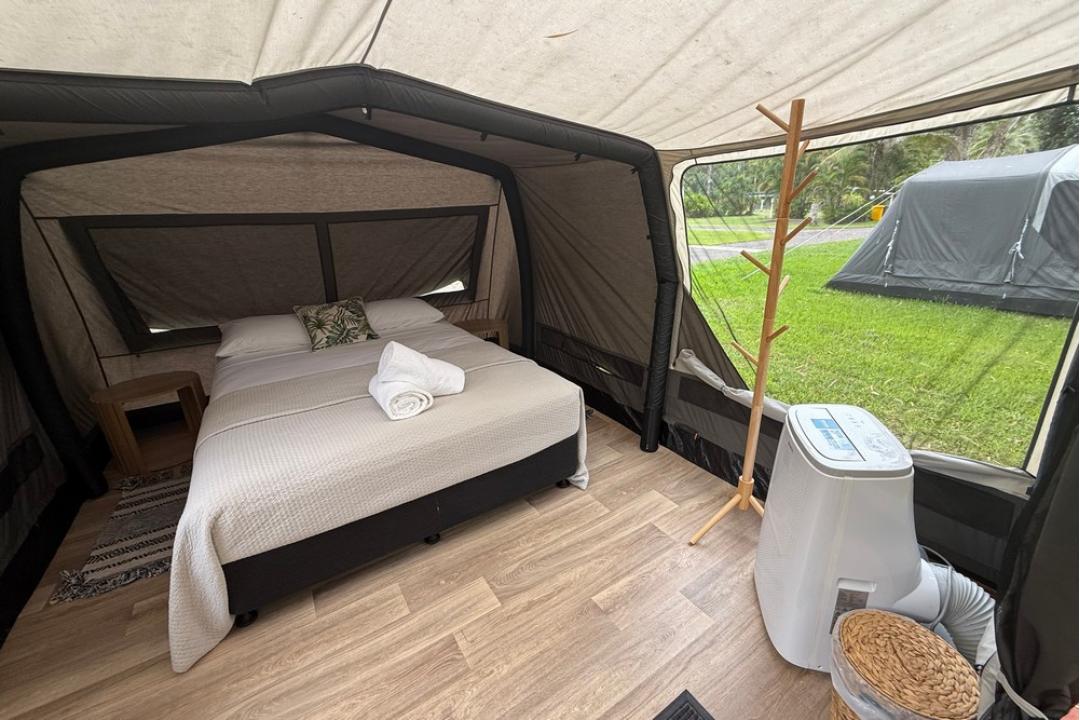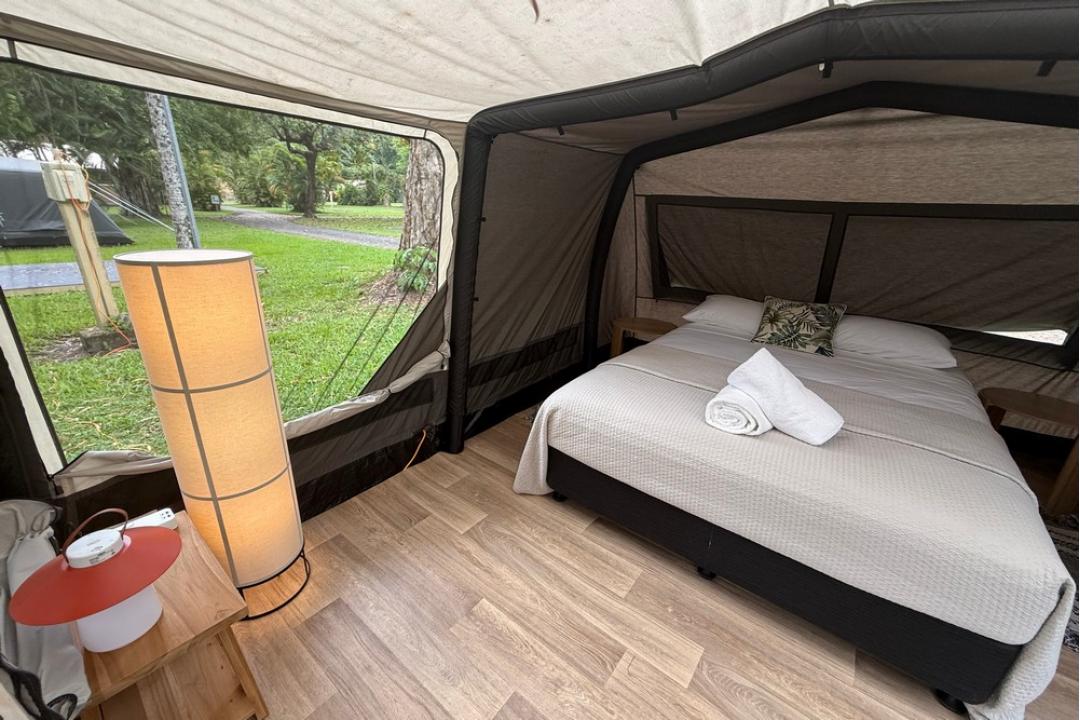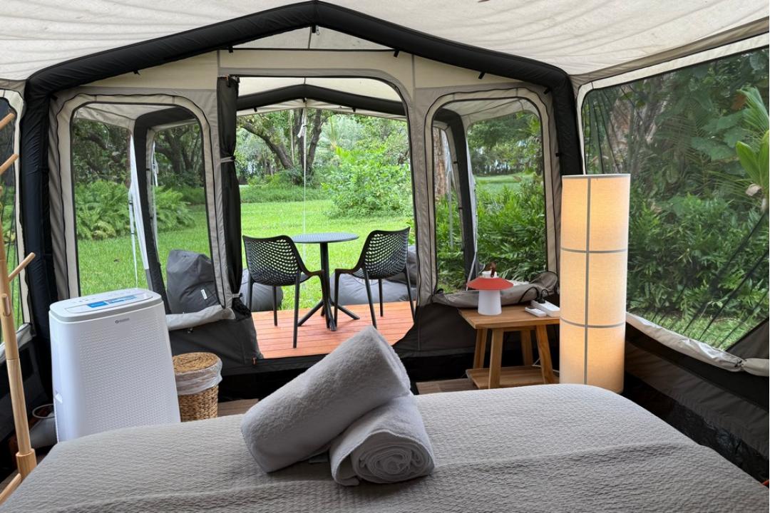 The basic camping option at Daintree Beach Resort offers pre-set tents equipped with a queen-size bed, air conditioning, bean bags, USB charging points, and Wi-Fi.