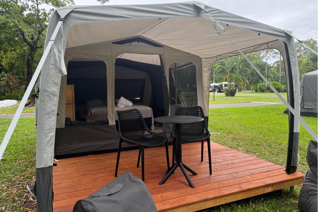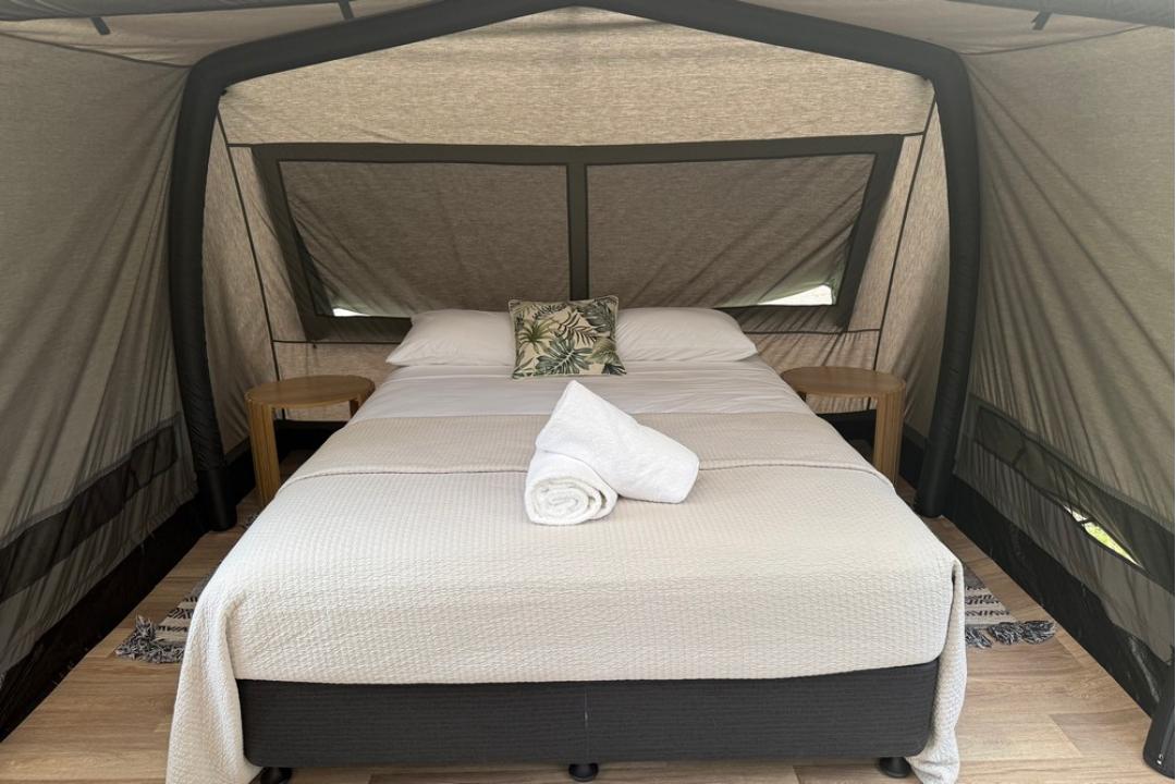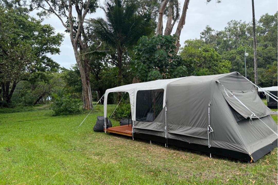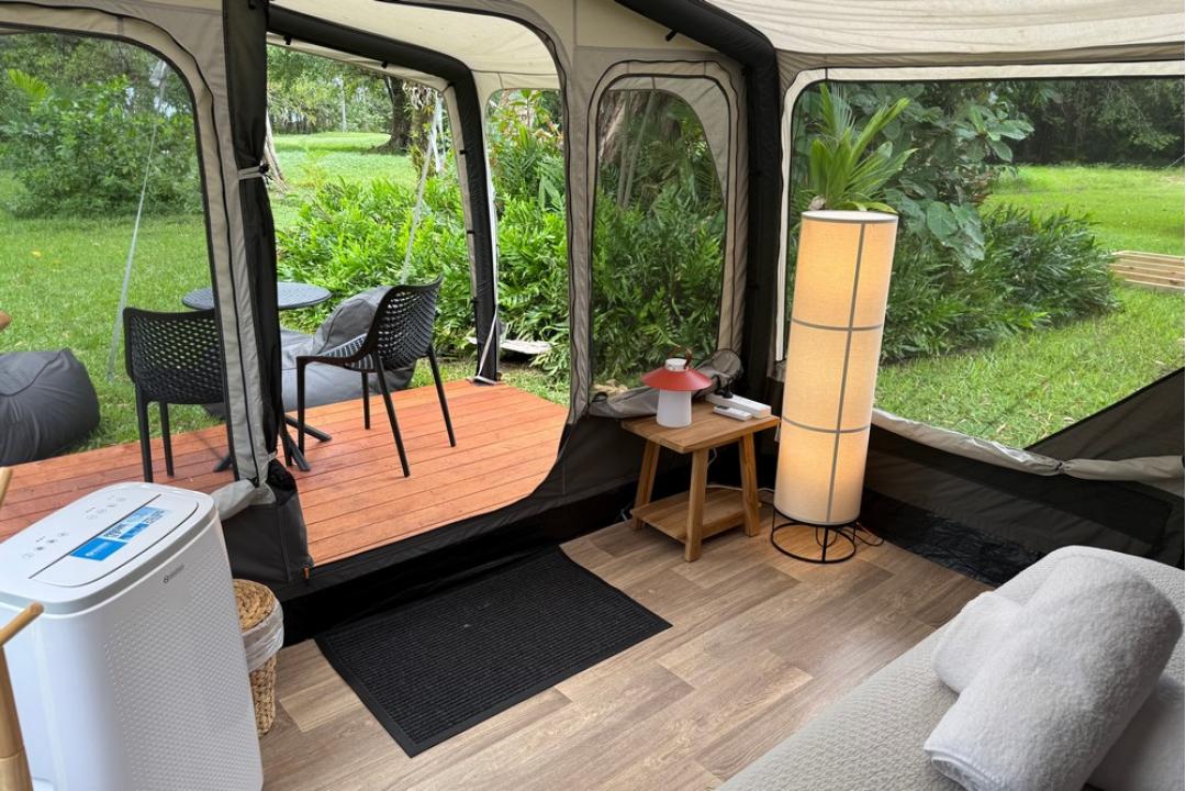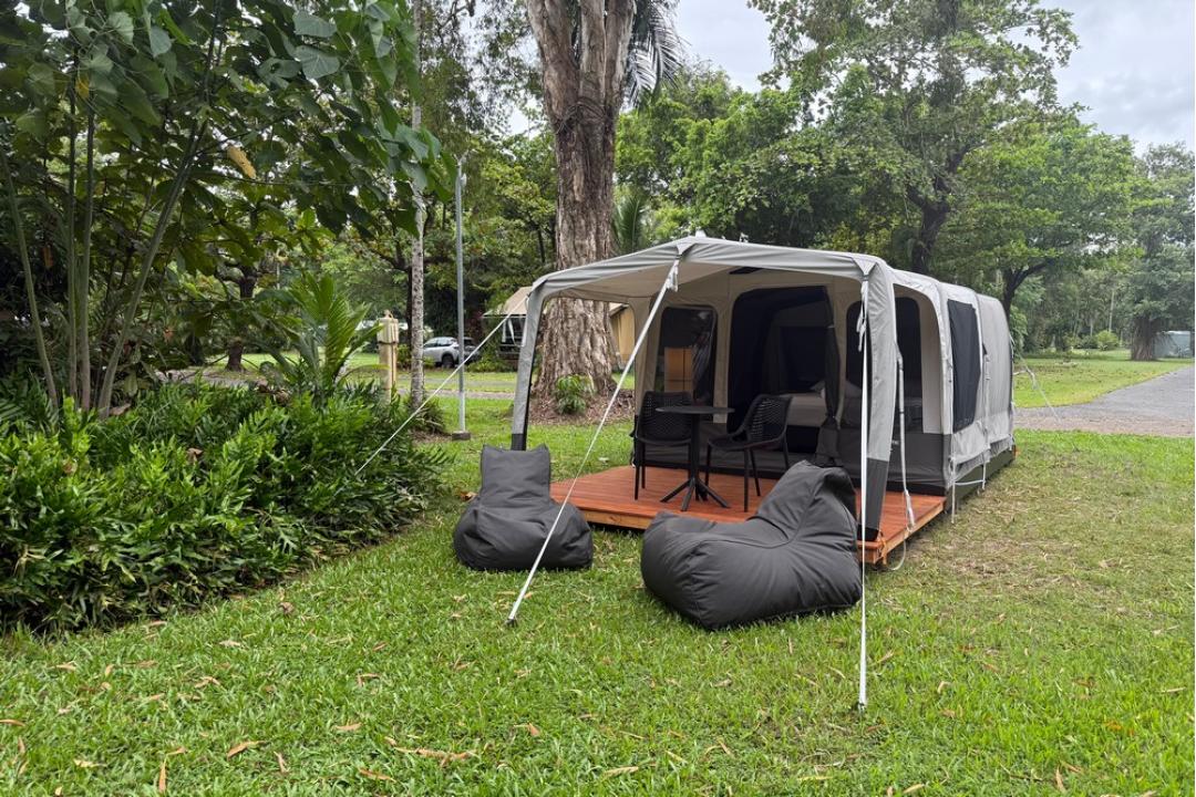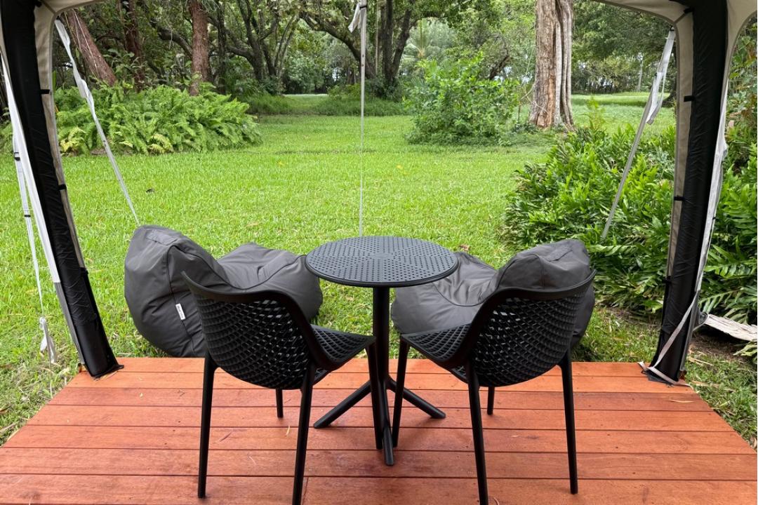 The basic camping option at Daintree Beach Resort offers pre-set tents equipped with a queen-size bed, air conditioning, bean bags, USB charging points, and Wi-Fi.